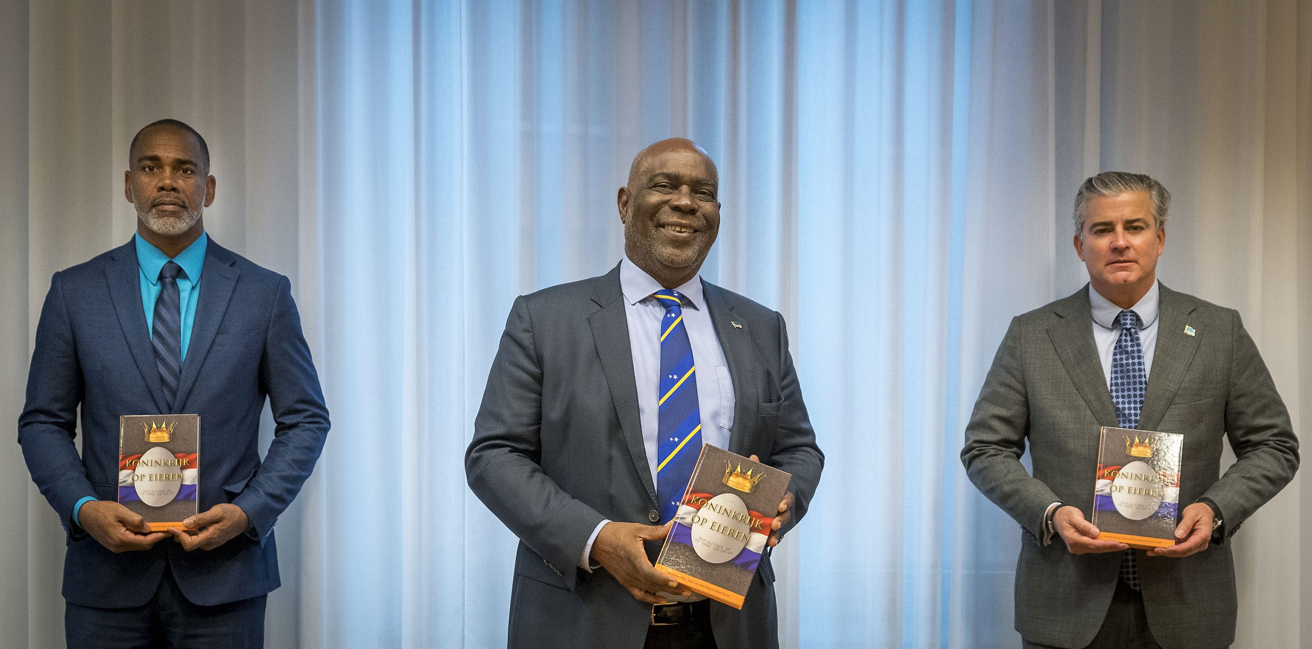 THE HAGUE – The Ministers Plenipotentiary of Curaçao, Aruba and Sint Maarten, Mr. Anthony Begina, Mr. Eddy Paris (interim) and Mr. René Volenius, alongside the Secretary of State for Kingdom Relations Mr. Raymond Knops, received the first copies of the book Koninkrijk op Eieren (Kingdom on Eggshells) about the 10 years since 10-10-10.