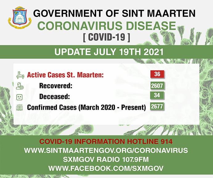 PHILIPSBURG, Sint Maarten – As of July 19th, there were thirteen (13) persons who tested positive for COVID-19; however six (6) persons have recovered; bringing the total active cases to thirty six (36). The total number of confirmed cases is now two thousand six hundred seventy seven (2677).