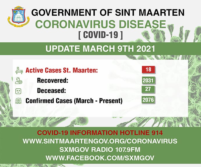 PHILIPSBURG, Sint Maarten – As of March 9th, there were two (2) persons who tested positive for COVID-19; however three (3) persons have recovered; bringing the total active cases to eighteen (18). The total number of confirmed cases is now two thousand and seventy six (2076).