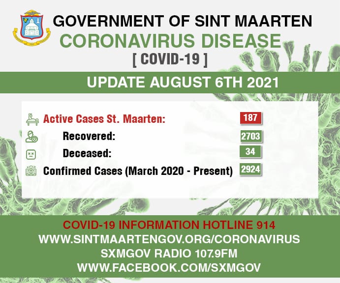 PHILIPSBURG, Sint Maarten – As of August 6th, there were thirty three (33) persons who tested positive for COVID-19; however thirteen (13) persons have recovered; bringing the total active cases to one hundred eighty seven (187). The total number of confirmed cases is now two thousand nine hundred twenty four (2924).