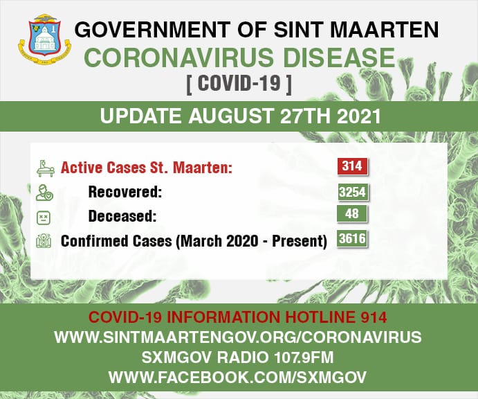 As of August 27th, there were thirty six (36) persons who tested positive for COVID-19; however thirty three (33) persons have recovered; bringing the total active cases to three hundred fourteen (314). The total number of confirmed cases is now three thousand six hundred sixteen (3616).