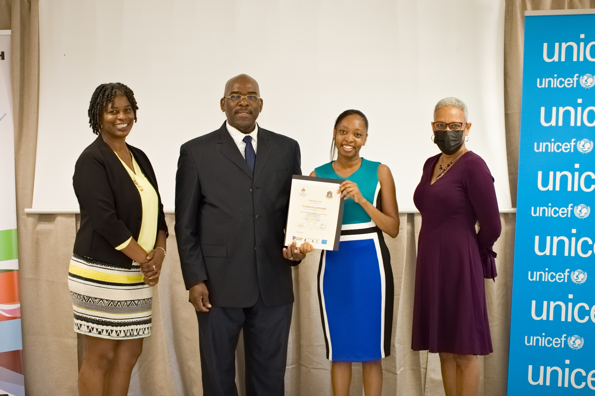 El Ministro de Educación, Cultura, Juventud y Deporte, el Honorable dres. Rodolphe E. Samuel: “felicitó a los nuevos Facilitadores por su arduo trabajo, y al Departamento de Juventud y UNICEF de los Países Bajos por continuar fortaleciendo la capacidad de los profesionales que trabajan con niños y sus familias”.