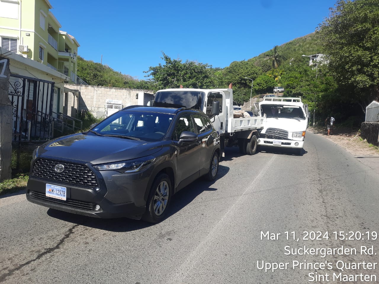 SUCKER GARDEN, Sint Maarten – El lunes 11 de marzo de 2024, aproximadamente a las 3:00pm, el Despacho Central recibió varias llamadas relacionadas con un accidente de tráfico en Sucker Garden Road. El incidente provocó el bloqueo de la vía, lo que provocó una importante congestión del tráfico en la zona. Atendiendo rápidamente a las llamadas, varias patrullas policiales y miembros del Departamento de Tráfico se desplazaron al lugar para atender la situación.
