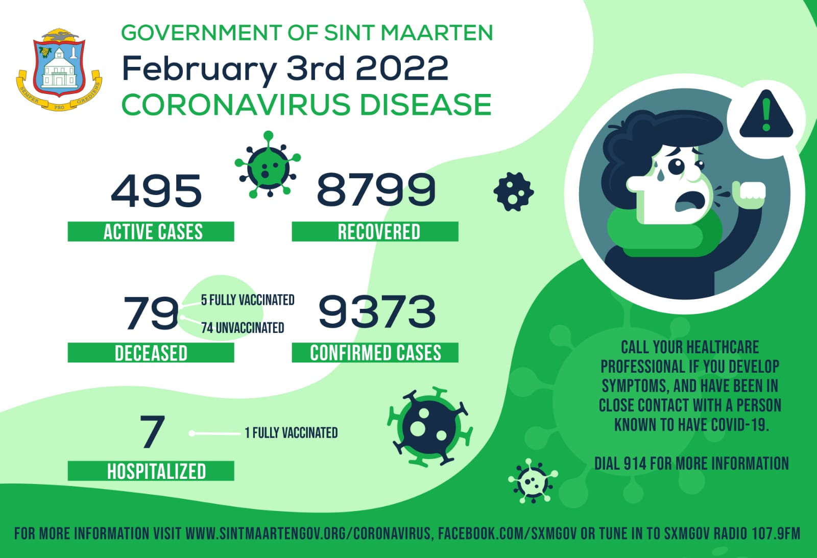 PHILIPSBURG, Sint Maarten – Para el 3 de febrero 20 personas dieron positivo, mientras que 35 personas se han recuperados. Se han disminuido 15 casos, lo que representa una disminución del 3% en los casos de 510 a 495.