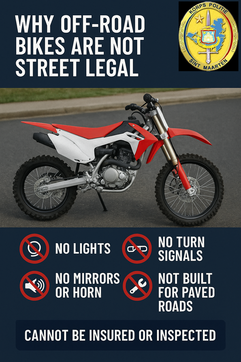 PHILIPSBURG, St. Maarten – La Policía de Sint Maarten (KPSM) aprovecha esta oportunidad para informar al público sobre el uso ilegal de motocicletas todoterreno (motos todoterreno) en la vía pública. Muchos conductores confunden las motos todoterreno con las motocicletas y pasolas comunes, pero existe una diferencia importante.