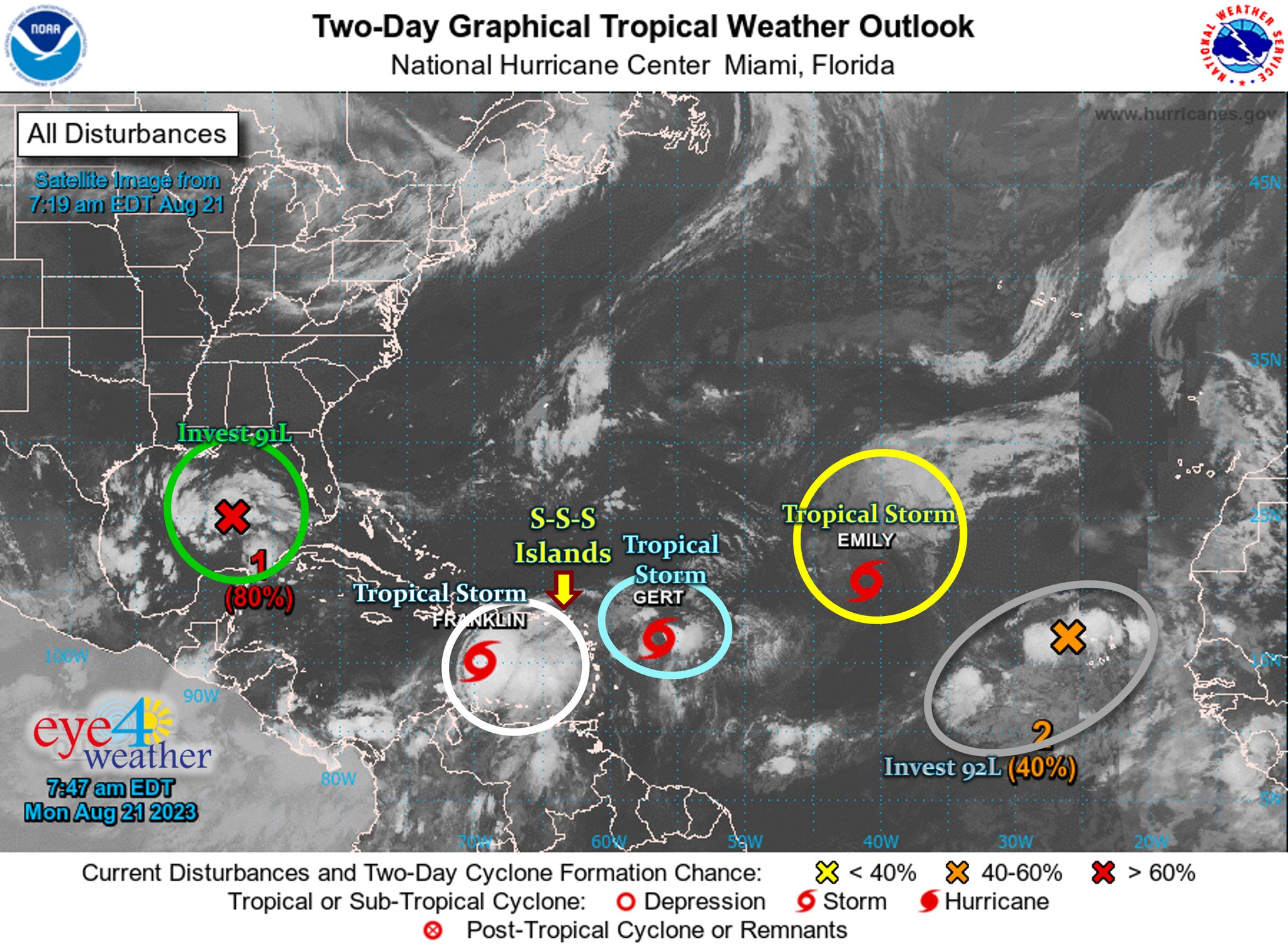 …Debido a que las islas SSS están encajadas entre TS Franklin y TS Gert, los vientos serán bajos, pero se volverán ventosos durante ?/⛈.