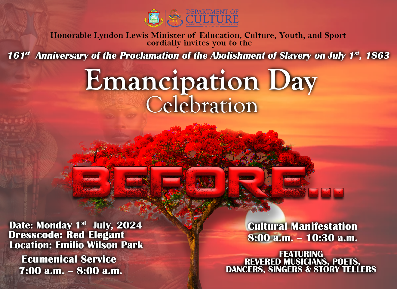 PHILIPSBURG, Sint Maarten – El 1ro de julio de 2024, se llevará a cabo la 161.ª celebración anual del Día de la Emancipación en el Parque Emilio Wilson en Cul de sac. El Ministro de Educación, Cultura, Juventud y Deportes, Honorable Lyndon Lewis invita a todos los ciudadanos interesados y a las personas que residen en Sint Maarten a unirse a la celebración con el tema “Antes…”. La celebración del Día de la Emancipación comenzará con un Servicio Ecuménico de la Iglesia a las 7:00am en la parte trasera del recinto del Parque Emilio Wilson, seguido de la manifestación cultural a las 8:00am.