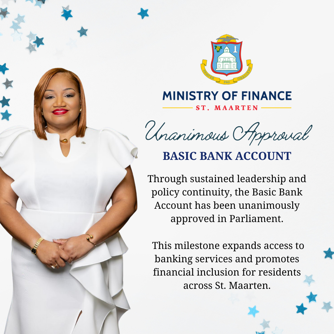 Philipsburg, Sint Maarten – La Ministra de Finanzas anuncia la aprobación de la Ley de Cuentas Bancarias Básicas, un paso importante para ampliar la inclusión financiera y garantizar el acceso de todos los residentes a los servicios bancarios esenciales.