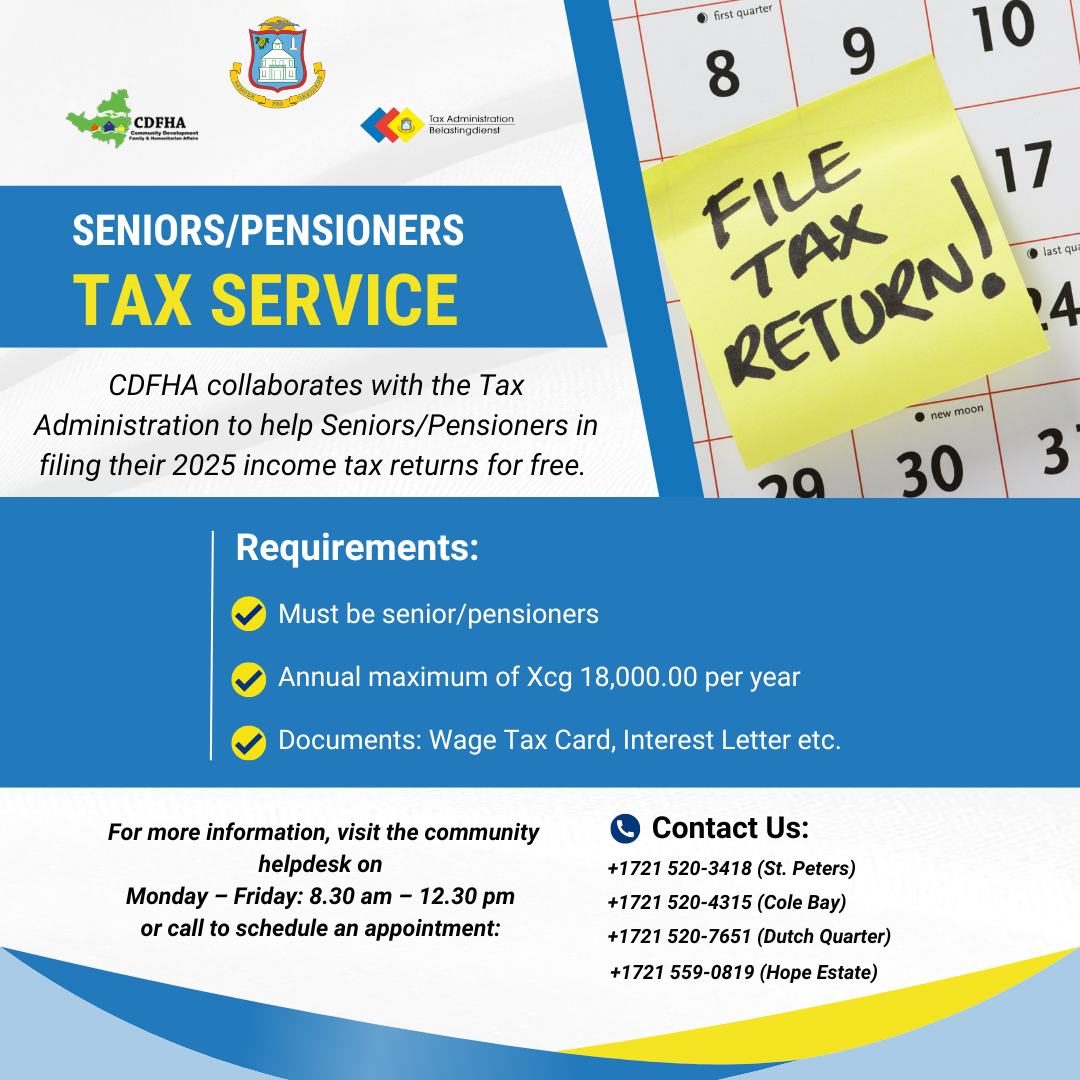 Philipsburg, St. Maarten – La Administración Tributaria de Sint Maarten, en colaboración con Desarrollo Comunitario, Familia y Asuntos Humanitarios (CDFHA), se complace en anunciar el lanzamiento del Programa Anual de Asistencia Tributaria para Personas Mayores para el período de declaración de impuestos de 2025, que comienza el 9 de marzo de 2026.