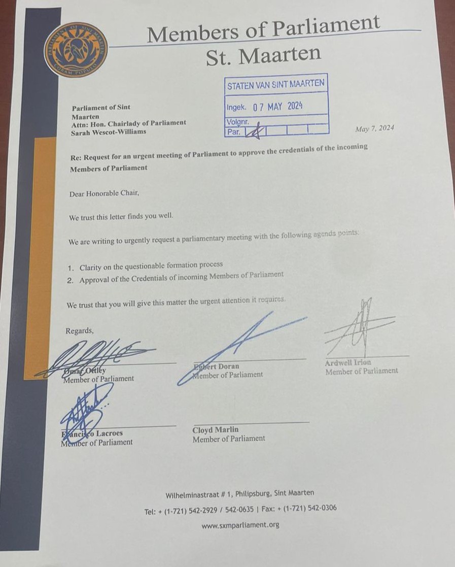 PHILIPSBURG, Sint Maarten – A la luz de los recientes acontecimientos relacionados con el proceso de investigación de antecedentes para los miembros entrantes del Parlamento, los miembros de la oposición en el Parlamento que representan a United People’s Party (UP) y National Alliance (NA) han presentado formalmente una carta a la Presidenta del Parlamento, la Honorable Sarah Wescot. -Williams, urgentemente, solicitando que la investigación de los documentos para los Parlamentarios entrantes no se retrase más y que se maneje antes del viernes de esta semana.