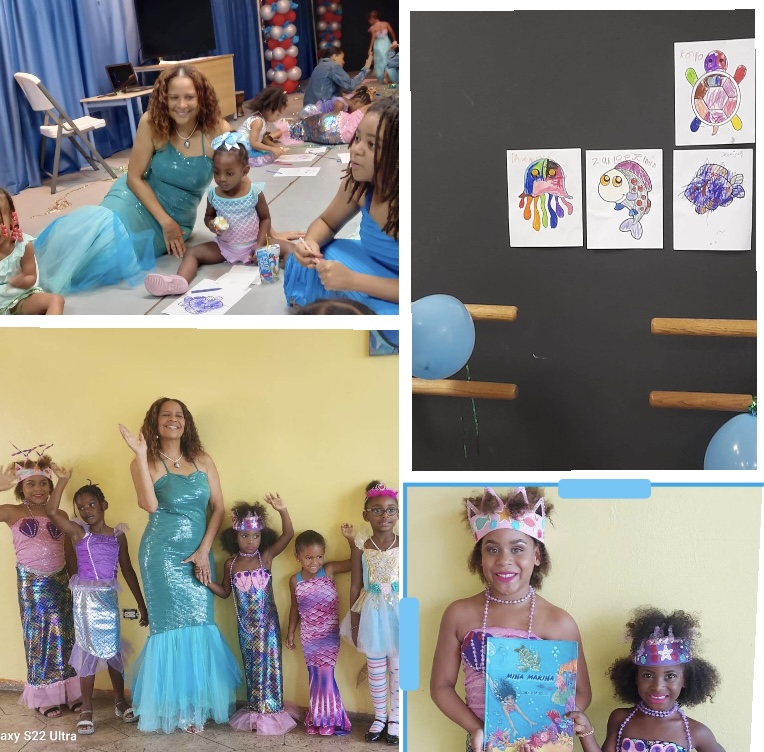 Padres e hijos con disfraces de sirenas y ropa casual colorida disfrutaron de una fiesta de pijamas con tema azul marino para lanzar el videolibro de cuentos Mina Marina, producido localmente, basado en el libro infantil de Loekie Morales, publicado en holandés e inglés en 2008.