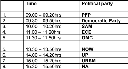 Teniendo en cuenta el espacio limitado y para facilitar una transición fluida entre partidos, no se permitirán entrevistas con líderes políticos y/o candidatos de partidos por parte de los medios de comunicación dentro de la Cámara del Parlamento. Se recomienda a los representantes de los medios de comunicación concertar entrevistas en lugares alternativos.
