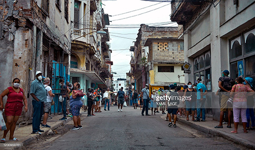 People queue to buy food in Havana, on February 2, 2021, as COVID-19 cases surge in the island nation. - Cases in Cuba, one of least-affected nations in the region by the coronavirus pandemic, have been surging in recent days. (Photo by Yamil LAGE / AFP) (Photo by YAMIL LAGE/AFP via Getty Images)
