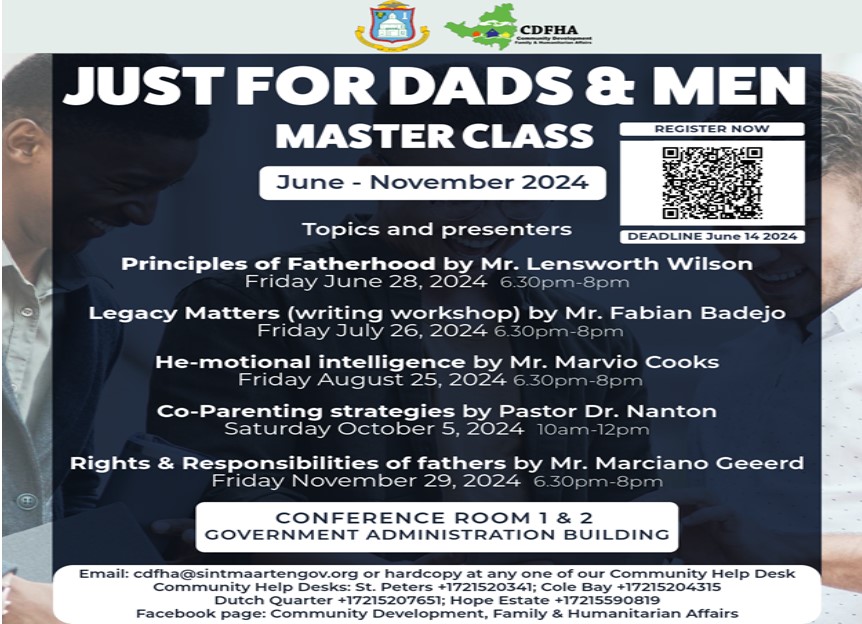 Great Bay, Sint Maarten – El Departamento de Desarrollo Comunitario, Familia y Asuntos Humanitarios. se complace en anunciar su clase magistral “Solo para papás y hombres”, una serie de sesiones informativas mensuales diseñadas específicamente para papás y hombres. Las sesiones mensuales, que se desarrollan desde junio hasta noviembre de 2024, cubren una variedad de temas esenciales facilitados por profesionales experimentados, a saber: