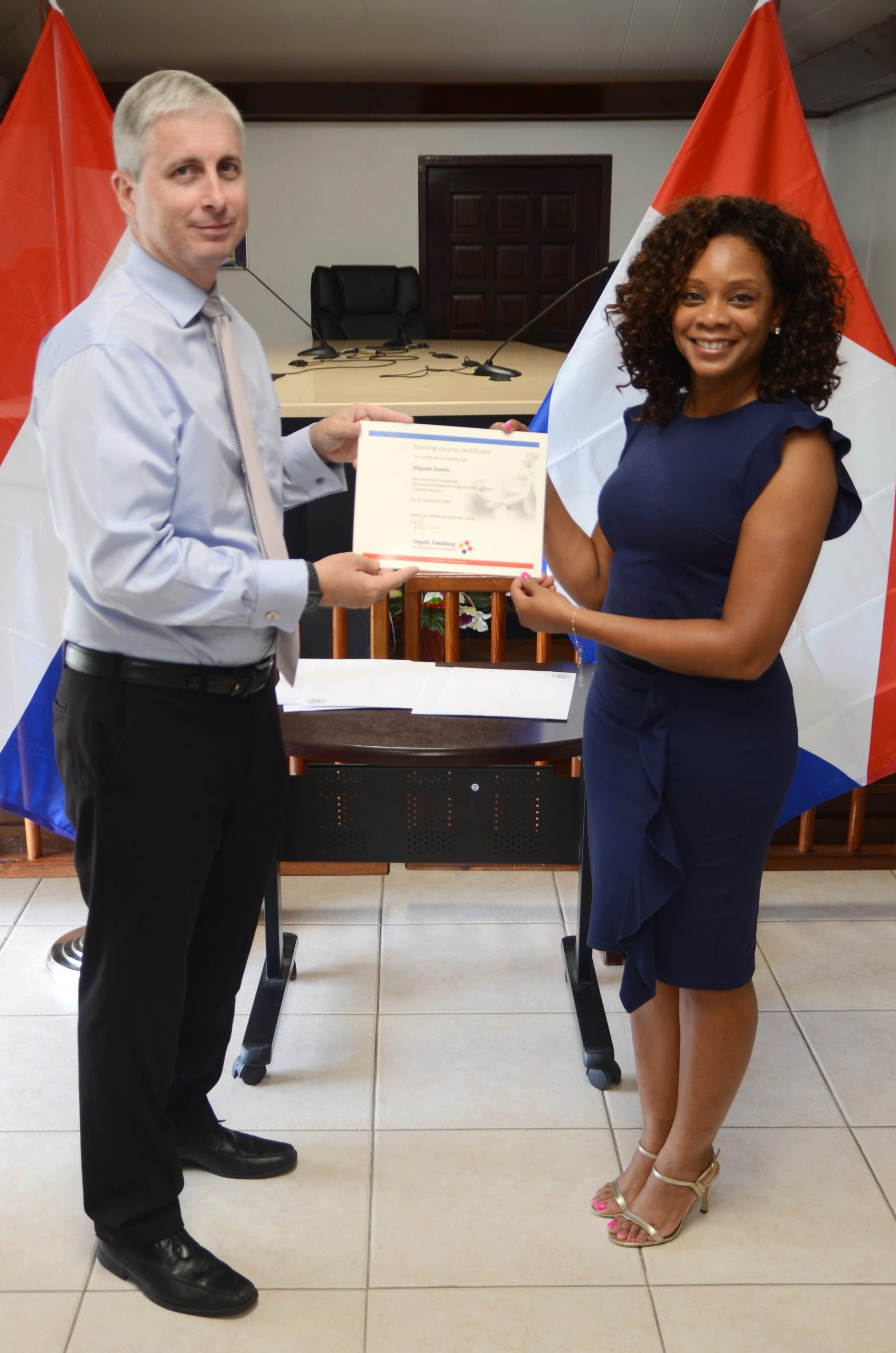 SABA—A ceremony was held at the Government Administration Building on Tuesday, September 15 during which the certificates of the management development program PEP and the emergency response team BHV course were handed out to a large group of civil servants of the Public Entity Saba. During a short ceremony, Island Governor Jonathan Johnson and Island Secretary Tim Muller handed out the certificates to the participants of the BHV and Management Development.