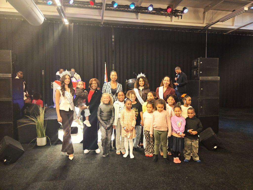 FOTO DE GRUPO: Una instantánea de los miembros más jóvenes de la diáspora de Sint Maarten en los Países Bajos junto con Miss Zuid Holland, Miss Caribe Neerlandés, Miss Universo Países Bajos y la Ministra Plenipotenciaria, la Dra. Gracita Arrindell, en la celebración del Día de St. Maarten 2025 en Rijswijk.