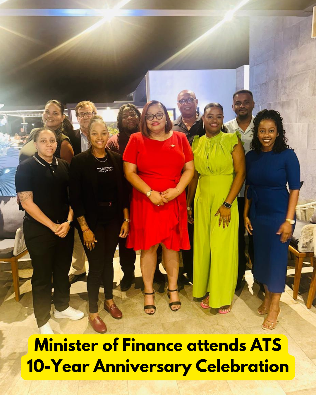 Fila de adelante: Russeline Zimmerman y Mariana Fleming (empleada de ATS); la ministra de Finanzas, Hon. Marinka J. Gumbs; Sidoney Surpris (empleados de ATS) y Nicole Marlin (jefa de gabinete del ministro de Finanzas).