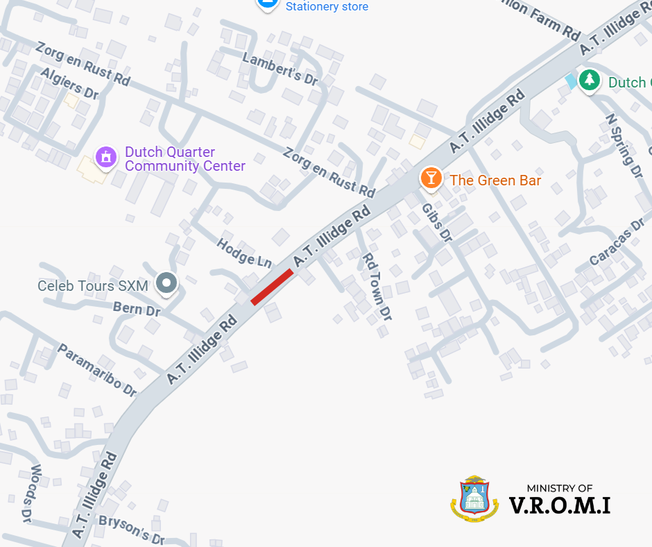 PHILIPSBURG, Sint Maarten – El Ministerio de Vivienda Pública, Planificación Espacial, Infraestructura y Medio Ambiente (VROMI) anuncia que A.T Illidge Road, cerca de la intersección de Hodges Lane en Dutch Quarter, se someterá a reparaciones viales necesarias que requerirán un cierre temporal de un carril el 31 de octubre de 2024. Este cierre entrará en vigencia a las 9:00pm y se espera que dure hasta la 1:00am.
