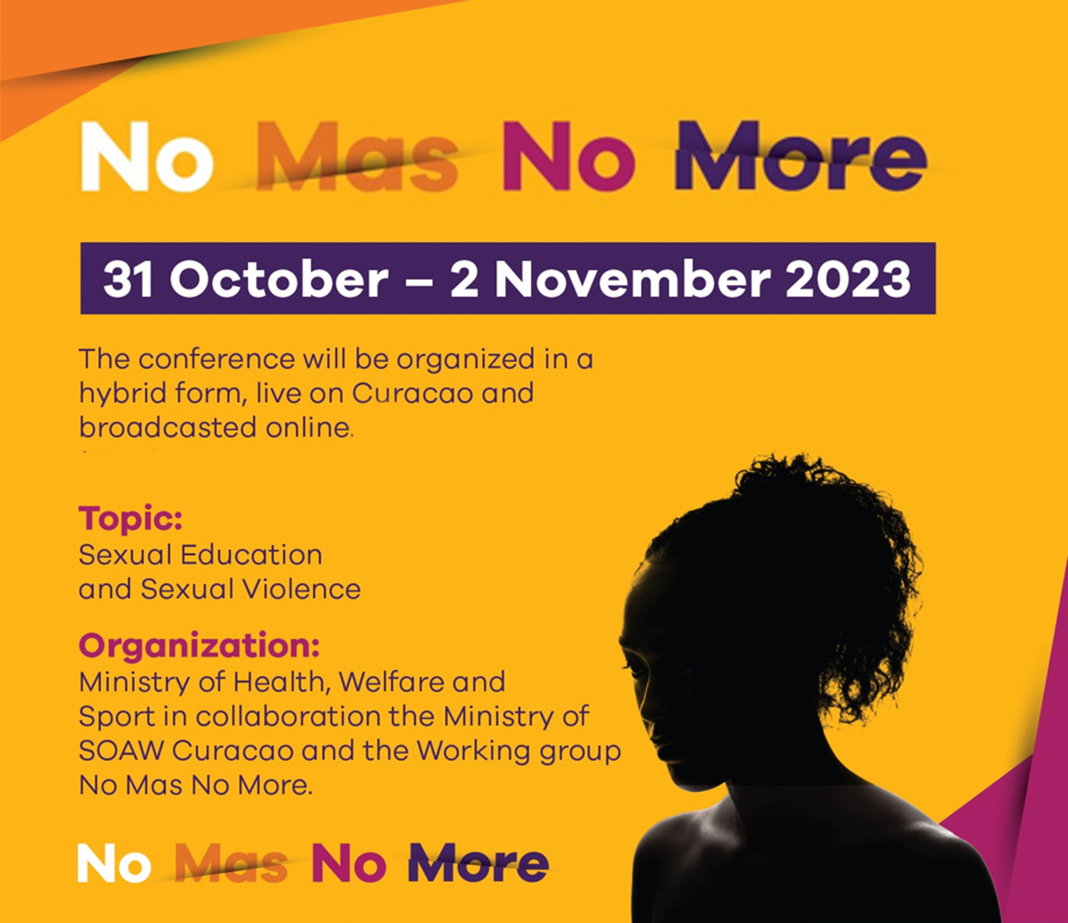 PHILIPSBURG, Sint Maarten – Del 31 de octubre al 2 de noviembre se llevará a cabo en Curaçao la conferencia bienal sobre violencia doméstica y abuso infantil “No Más, No More”.