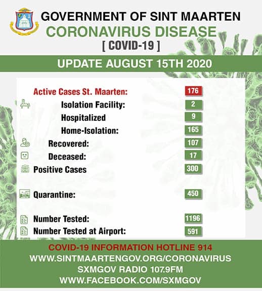 PHILIPSBURG, Sint Maarten — As of August 15th, St. Maarten has confirmed twenty-six new cases of persons who have tested positive for the Corona Virus (COVID-19). The new total of confirmed cases now stand at 300.