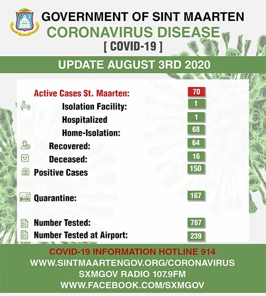 PHILIPSBURG , Sint Maarten— As of August 3rd, at 18:00, St. Maarten has confirmed four new cases of persons who have tested positive for the Corona Virus (COVID-19). The new total of confirmed