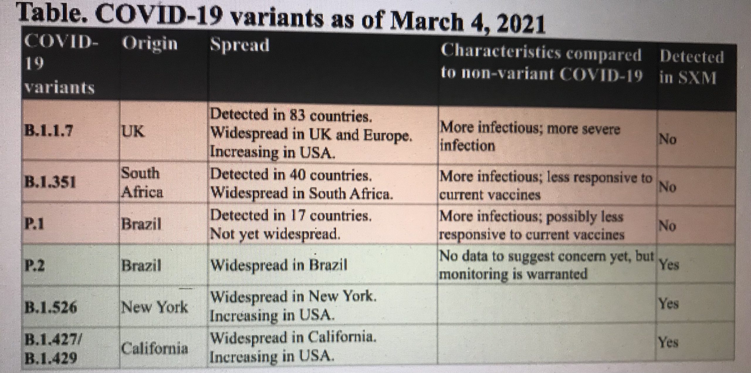 The table below provides an overview of the most common variants that are circulating in the world, their origin, spread, characteristics and whether they have been detected on Sint Maarten to date.