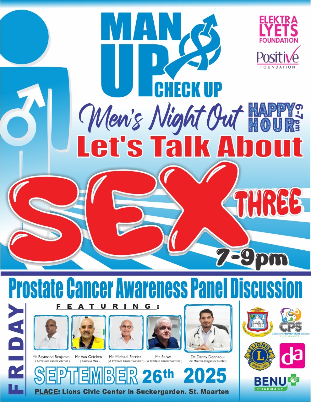 Se ha programado un panel de discusión para concientizar sobre el cáncer de próstata para el viernes 26 de septiembre en el Centro Cívico Lions de Suckergarden, de 7:00pm a 9:00pm. El CPS anima a los hombres de la comunidad a participar e informarse. El panel de discusión contará con la participación de varios residentes destacados de Sint Maarten, incluyendo una pareja que sobrevivió al cáncer de próstata.