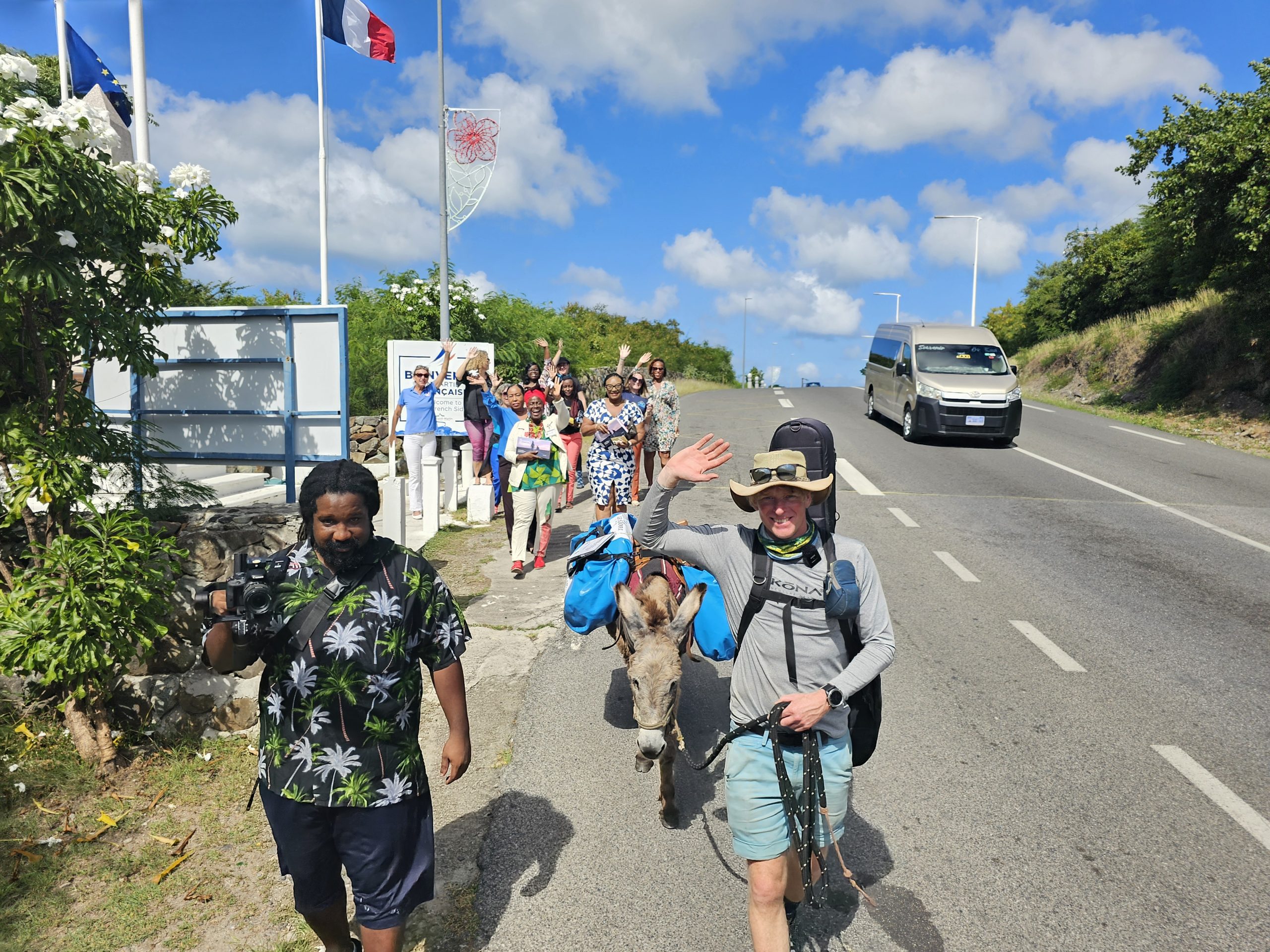 Una reunión de partes interesadas que incluyó a los jefes de los departamentos de cultura de ambos lados de la isla, Clara Reyes del lado holandés y Claudine Lake del lado francés, estuvieron allí para señalar el inicio de la caminata en la que Ridder caminará con su creador de teatro local. sus homólogos Sjorensly Valies y King Vers caminando con un burro local llamado Marie-Louise.