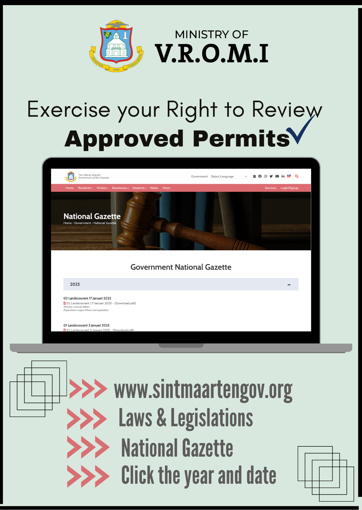 Philipsburg, St. Maarten – El Ministerio de Vivienda Pública, Ordenación del Territorio, Medio Ambiente e Infraestructura (VROMI) recuerda a todos los ciudadanos su derecho democrático a revisar los permisos aprobados por el Departamento de Permisos del Ministerio.