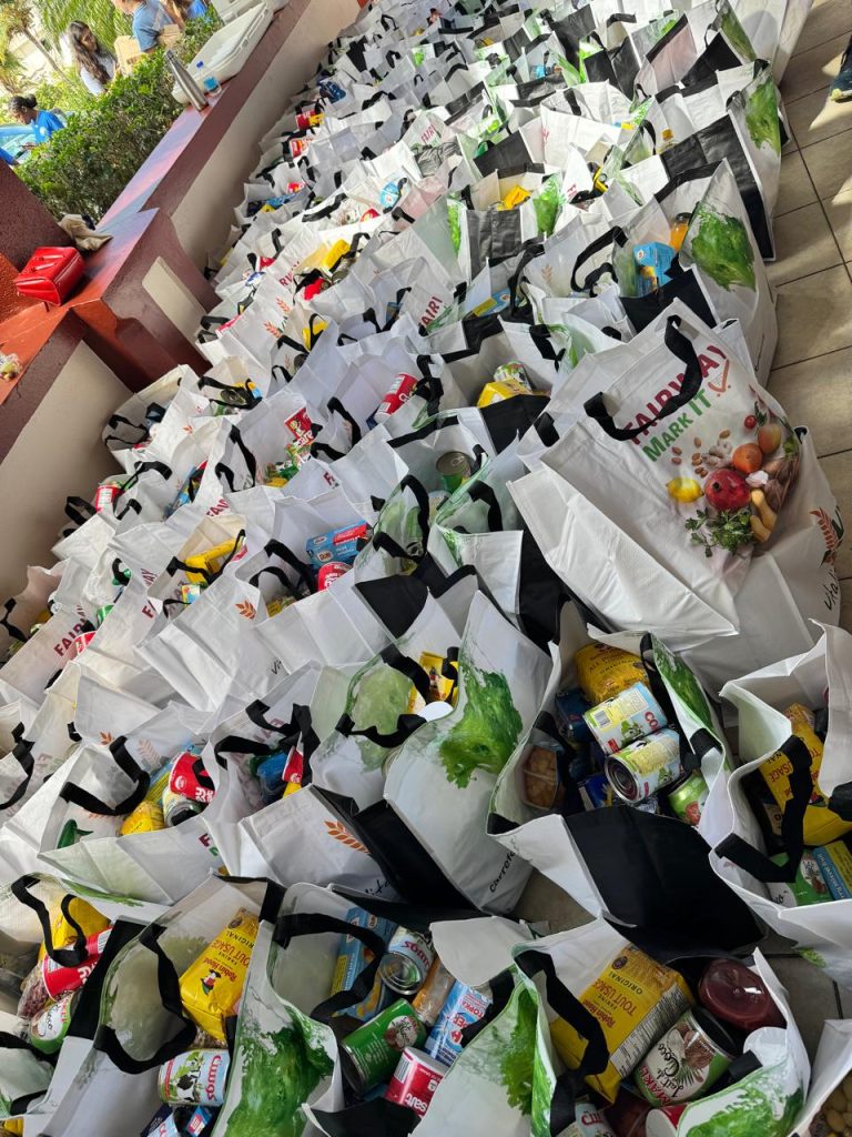 PHILIPSBURG, St. Maarten – Miembros del Club Rotario de St. Maarten, los clubes Learning Unlimited Interact y EarlyAct, y el Club Interact de la Academia de St. Maarten se reunieron hoy en Belair Community Center para preparar 225 canastas de alimentos para las próximas fiestas navideñas. Un grupo de voluntarios preparó una cadena de montaje con harina, arroz, cereales, verduras enlatadas y muchos otros alimentos necesarios para una gran cena navideña, colocándolos en bolsas de Carrefour Market y organizándolas para su entrega el mismo día directamente a quienes las necesitan.