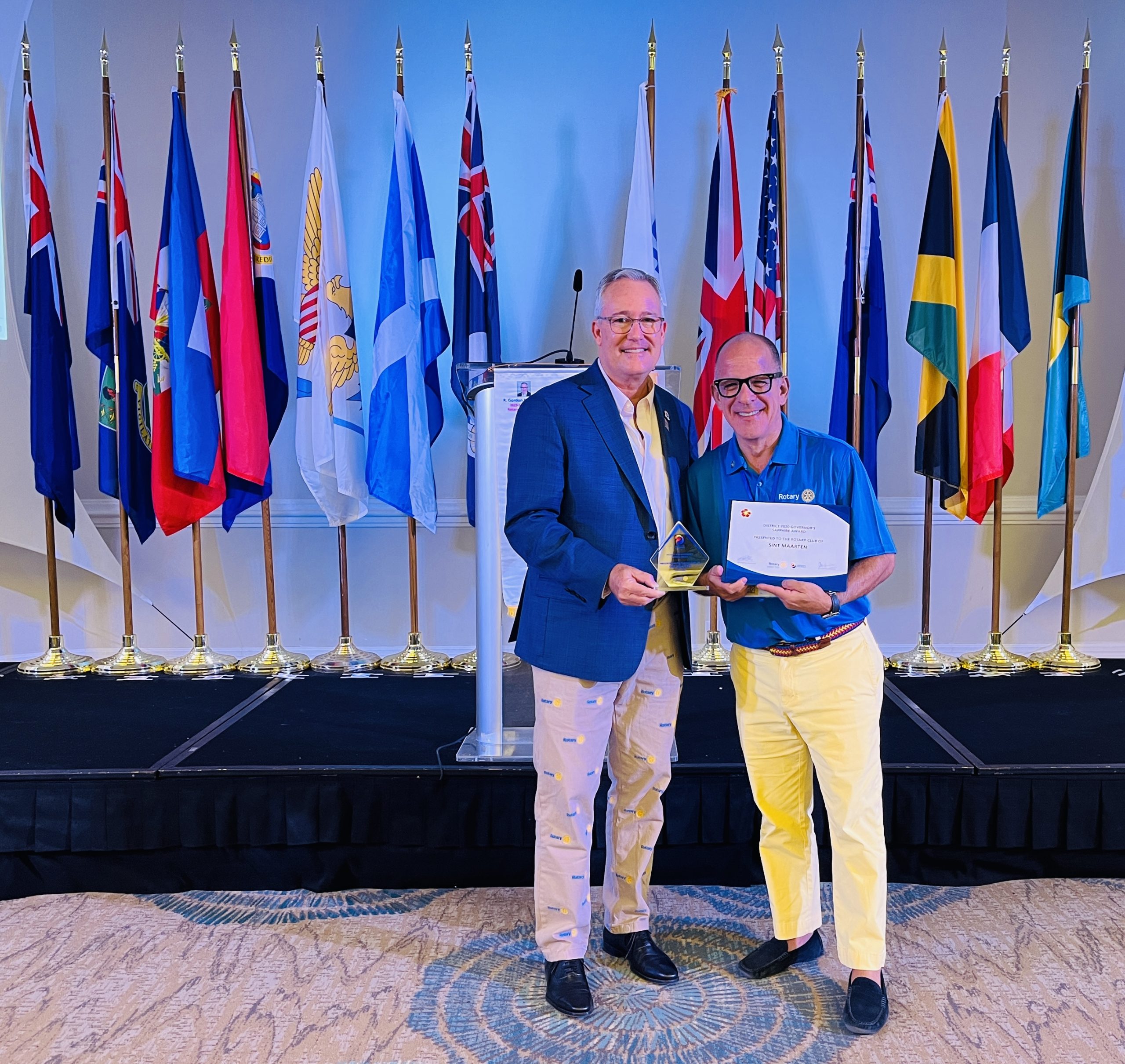 GRAN CAIMÁN, CI – El 2 de mayo, el Club Rotario de Sint Maarten recibió el Premio ORO por su servicio a la comunidad de Sint Maarten en la Conferencia del Distrito Rotario 7020, “Crear Esperanza en el Mundo”. El premio fue entregado al Club por el Gobernador del Distrito Rotario 7020, David Kirkaldy, en el Grand Cayman Marriott y fue aceptado, en nombre del Club, por su Presidente, Jeffrey “Dr. Soc” Sochrin.