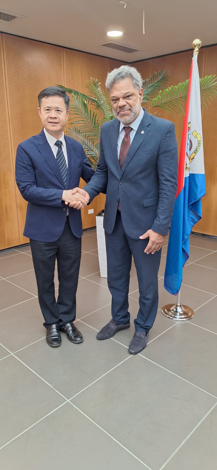 Philipsburg, St. Maarten — El Primer Ministro, el Honorable Dr. Luc Mercelina, recibió la semana pasada a S.E. Zhang Kaibin, Cónsul General de la República Popular China en Willemstad, en una visita de cortesía al Gabinete del Primer Ministro. La reunión brindó la oportunidad de fortalecer el diálogo diplomático, reconocer las valiosas contribuciones de la comunidad china en Sint Maarten y explorar áreas de cooperación práctica centrada en las personas, incluyendo intercambios culturales e iniciativas económicas a pequeña escala.