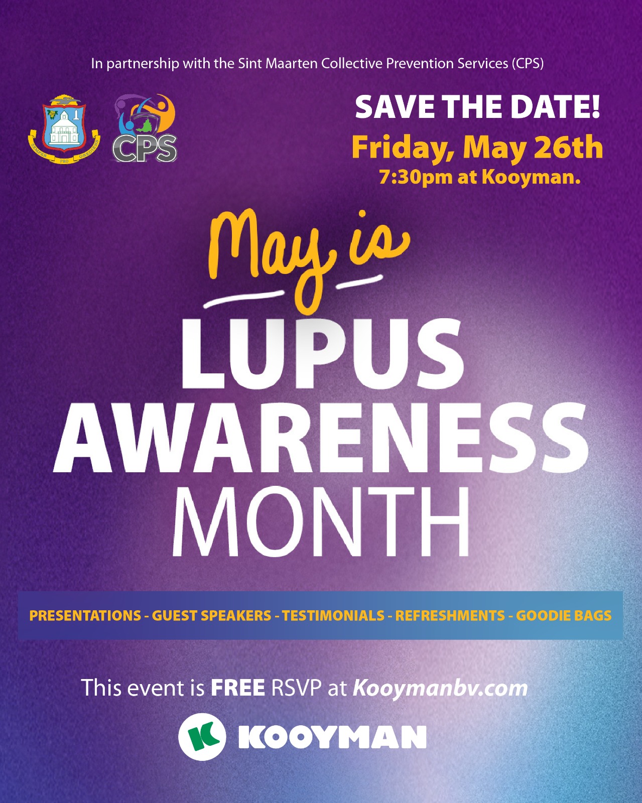 Los Servicios de Prevención Colectiva (CPS), un departamento del Ministerio de Salud Pública, Desarrollo Social y Trabajo (Ministerio VSA), se unió a Kooyman para organizar un evento para el Mes de Concientización sobre el Lupus el viernes 26 de mayo en Kooyman en Cay Hill. El evento comenzará a las 7:30pm.