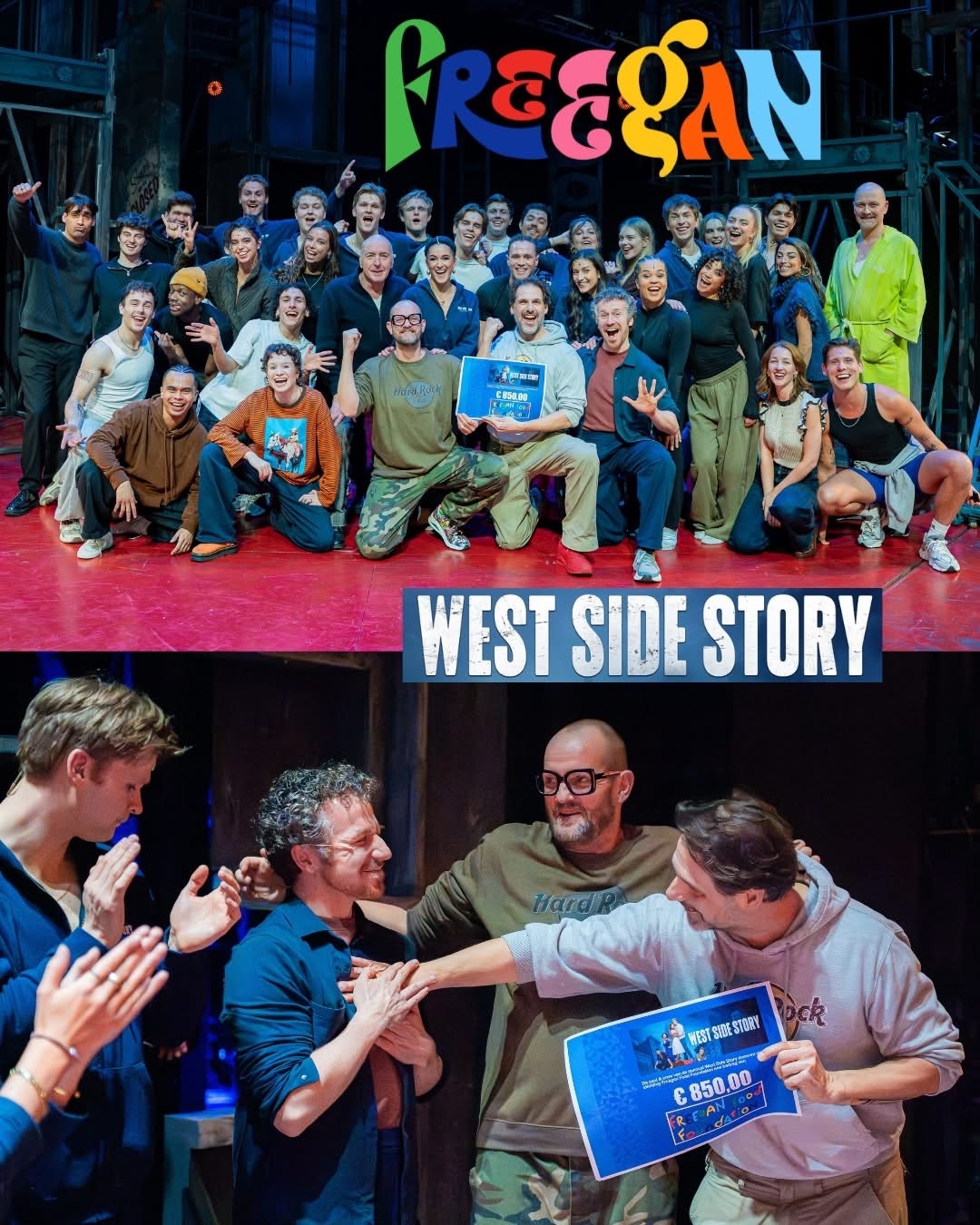 Ámsterdam, Holland – Durante el estreno en Ámsterdam de West Side Story, DJ y Joost vivieron un momento profundamente emotivo. El elenco y el equipo de la producción holandesa donaron conjuntamente 1,000 € a Freegan Food Foundation.
