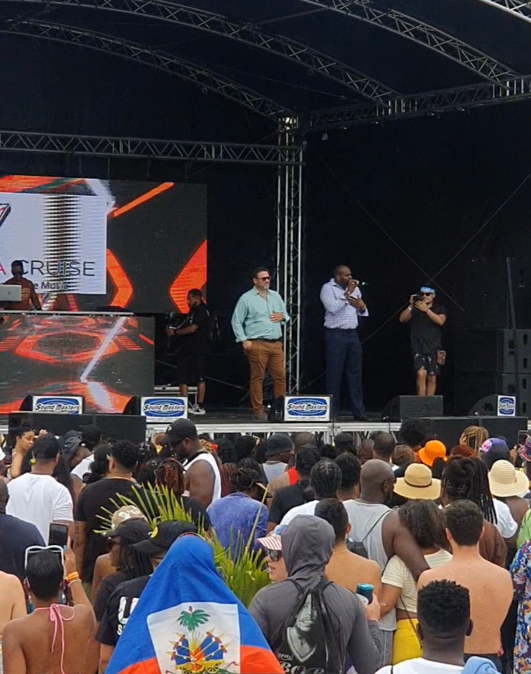 FOTO: De izquierda a derecha: Ministro Lambriex y Ministro Ottley en el escenario durante el crucero Ubersoca.