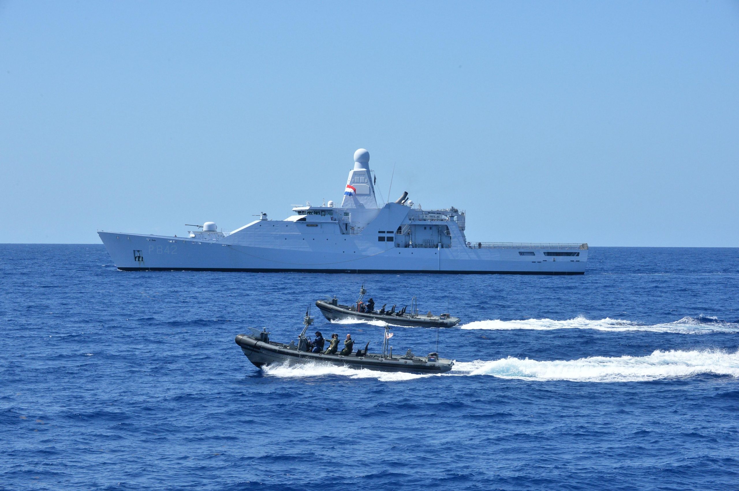 Esa misma noche, el buque estación HNLMS Friesland avistó una embarcación sospechosa en el Mar Caribe. Se trataba de una lancha rápida, una embarcación de uso frecuente para el tráfico de drogas. En cuanto se evidenció la situación, las dos embarcaciones de interceptación rápida (Frisc) del Friesland se desplegaron para acercarse a la embarcación.