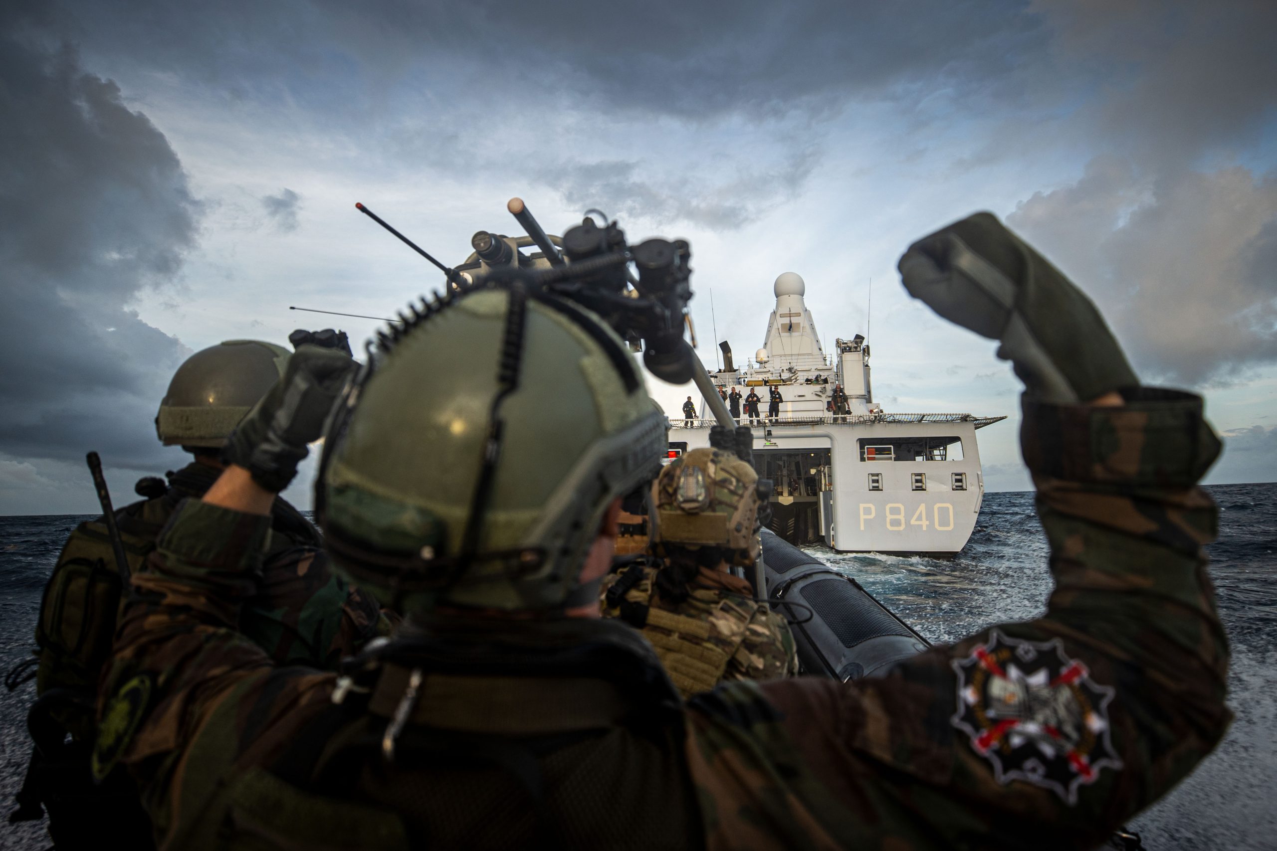 El avión de patrulla de la Guardia Costera del Caribe detectó un barco sospechoso en el mar Caribe a primera hora de la mañana. El HNLMS Holland actuó de inmediato, se dirigió hacia el barco sospechoso y envió sus rápidos buques interceptores hacia él.