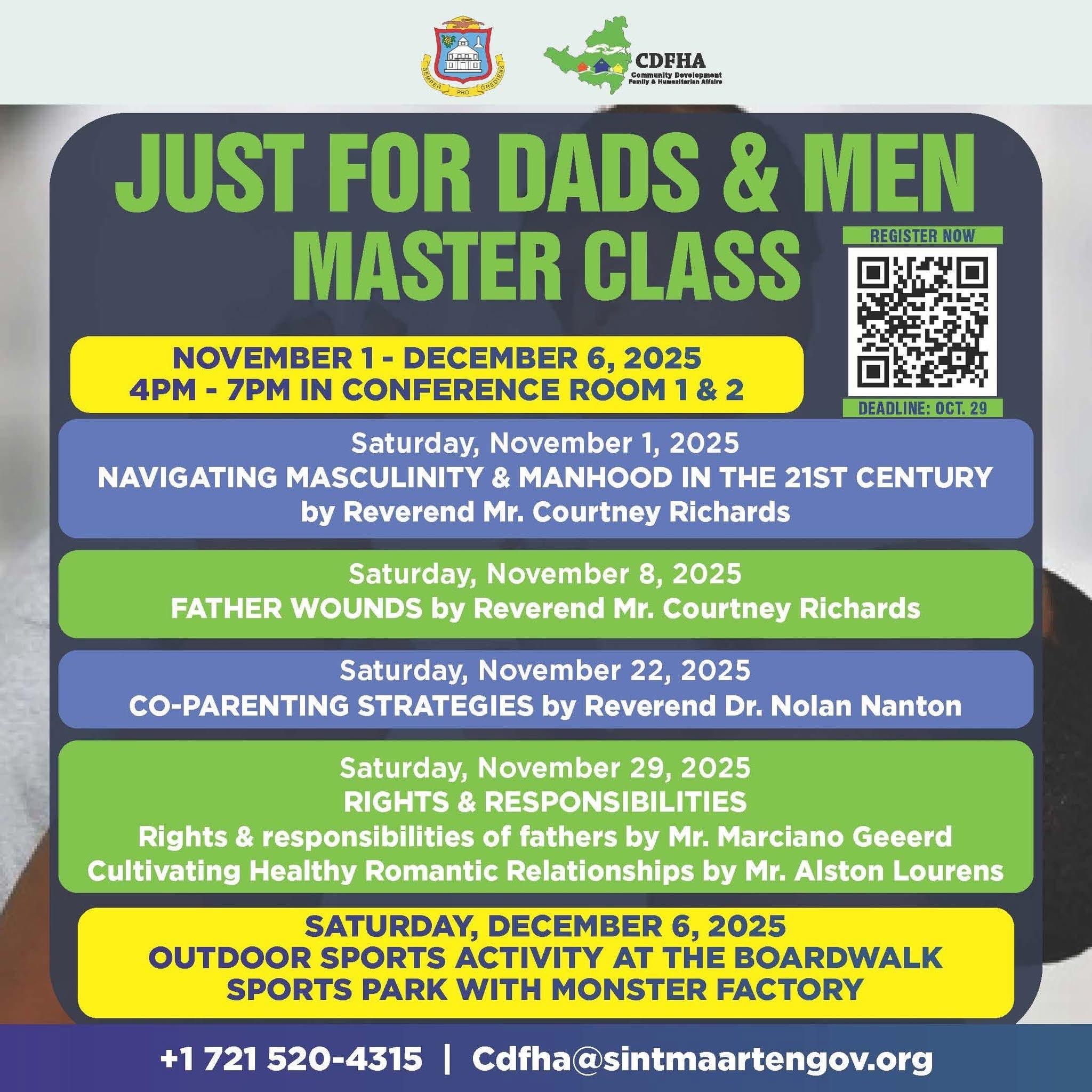 Philipsburg, Sint Maarten — El Ministro de Salud Pública, Desarrollo Social y Trabajo, el Honorable Richinel Brug, se complace en anunciar la segunda edición del taller “Solo para padres y hombres”, organizado por el Departamento de Desarrollo Comunitario, Familia y Asuntos Humanitarios (CDFHA).