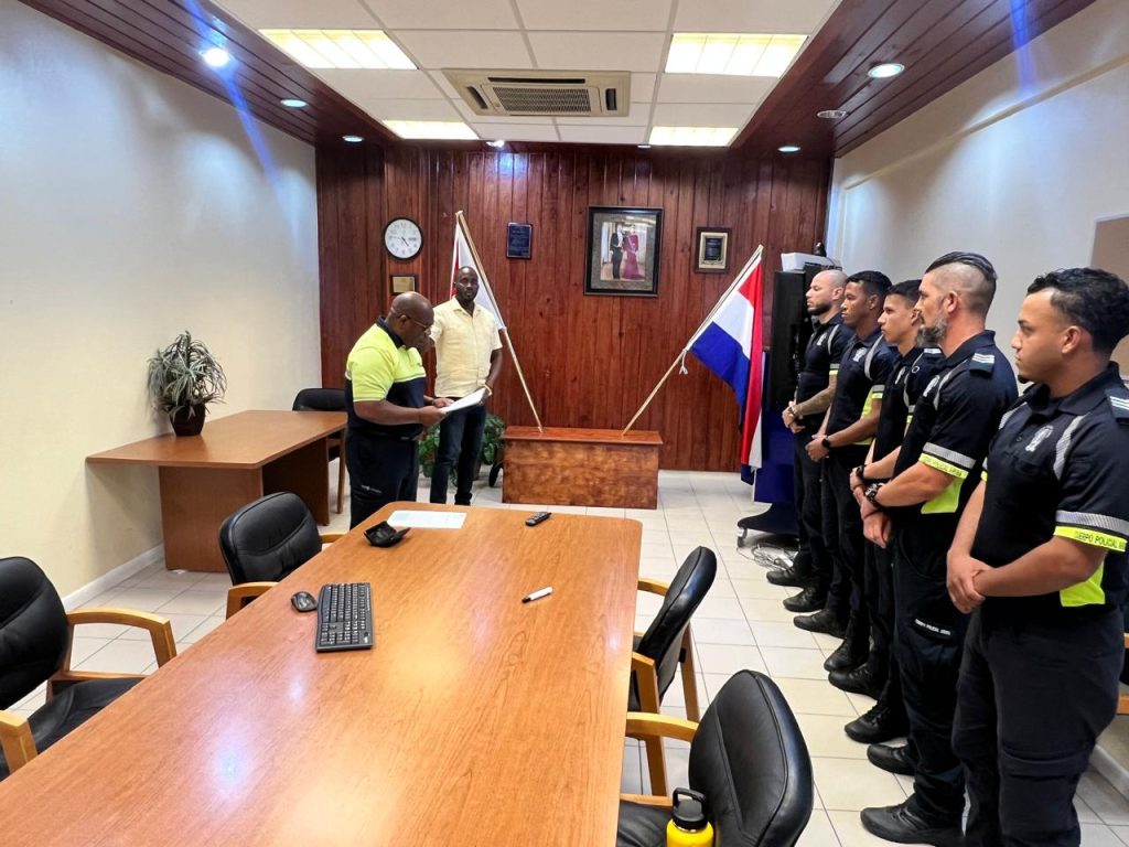 PHILIPSBURG, Sint Maarten – El lunes 12 de agosto de 2024, el Honorable Ministro de Justicia y Ministro interino de Educación, Cultura, Juventud y Deportes, Sr. Lyndon Lewis, juramentó a cinco oficiales de Aruba que llegaron a St. Maarten para reforzar el equipo policial local.