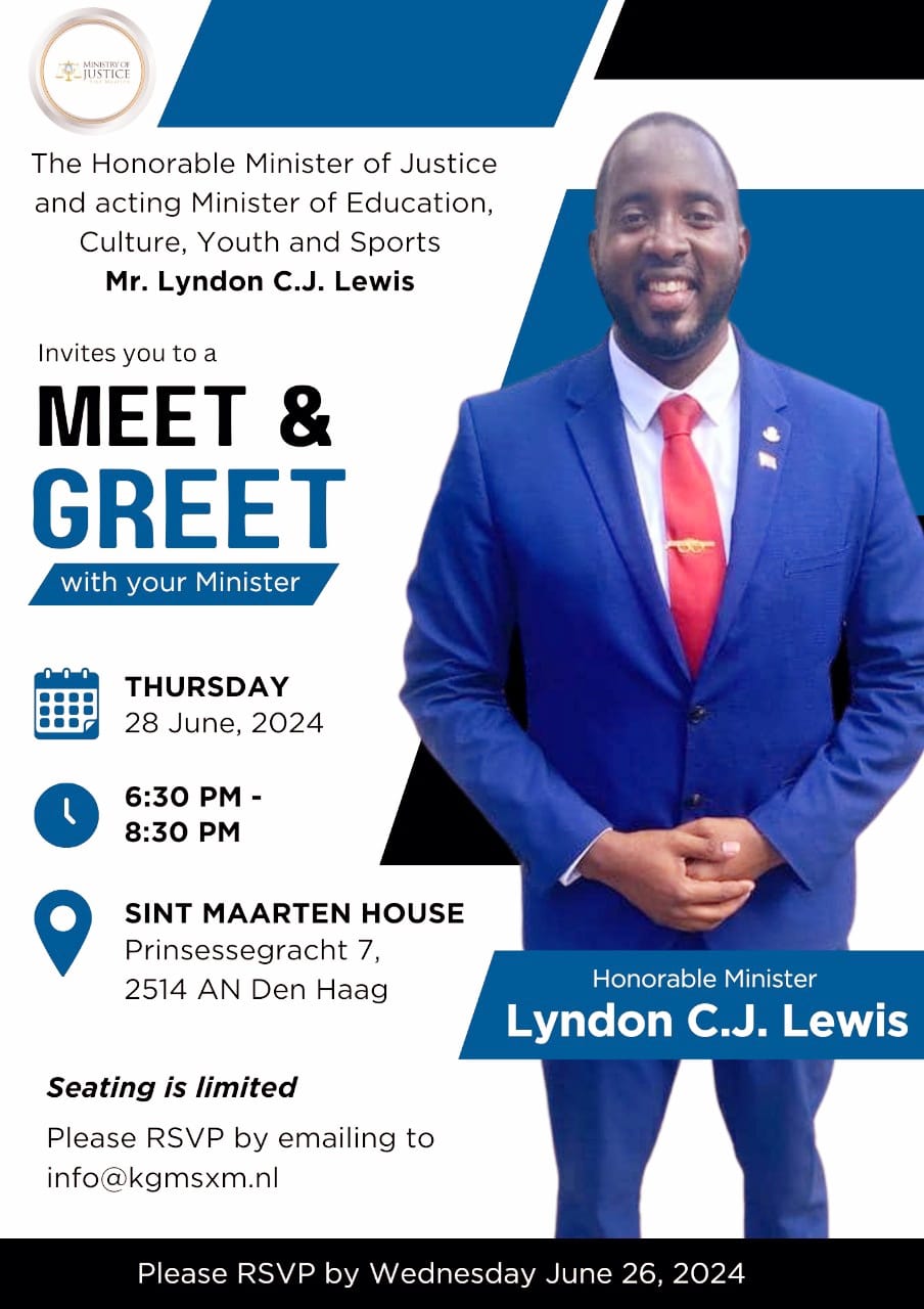 El Honorable Ministro de Justicia y Ministro interino de Educación, Cultura, Juventud y Cultura, Lyndon Lewis, será el anfitrión de un encuentro en la Casa St. Maarten en los Países Bajos.