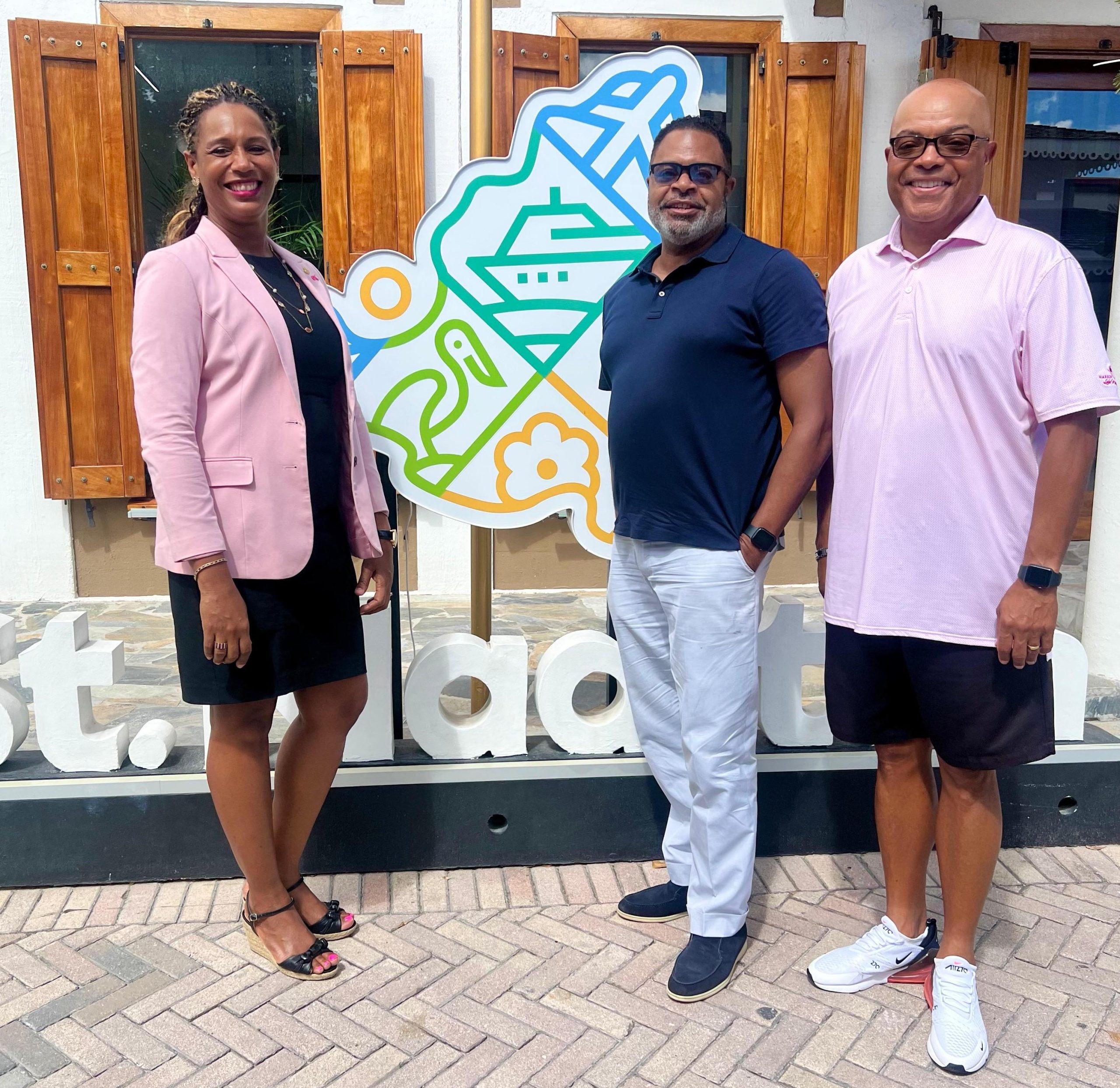 FOTO: La Ministra de Turismo, Asuntos Económicos, Transporte y Telecomunicaciones, Grisha Heyliger-Marten (izq.), con Mark Adkins, director ejecutivo de Soul Beach Festival Productions (centro) y Darren Featherstone, del equipo de Soul Beach, frente a la Oficina de Turismo de St. Maarten en Frontstreet, Philipsburg.