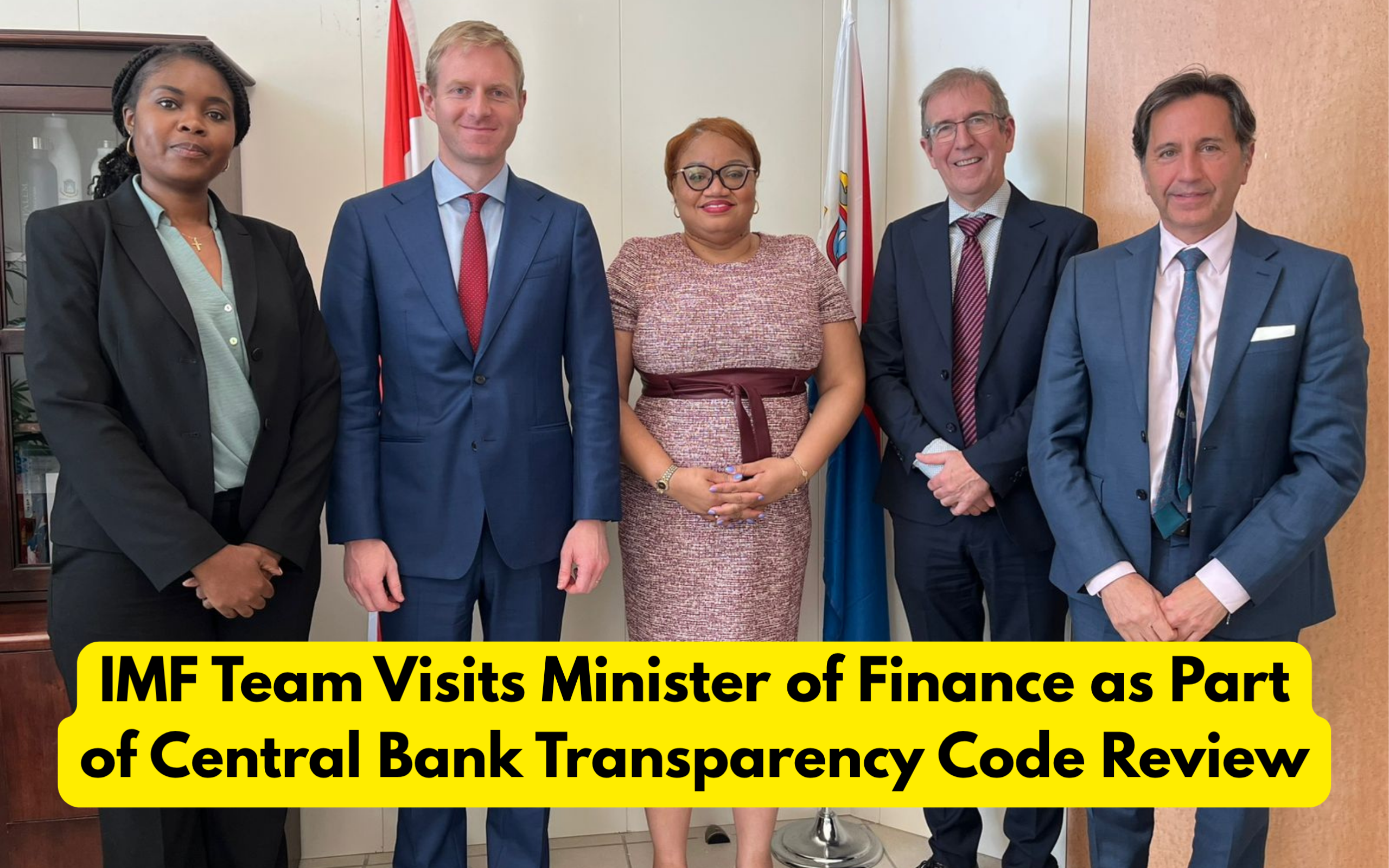 Philipsburg, St. Maarten – El Ministro de Finanzas recibió al equipo de la misión del Fondo Monetario Internacional (FMI), encabezado por el Sr. Smith, que actualmente realiza una revisión del Código de Transparencia del Banco Central (CTC) a solicitud del Banco Central de Curaçao y Sint Maarten (CBCS).