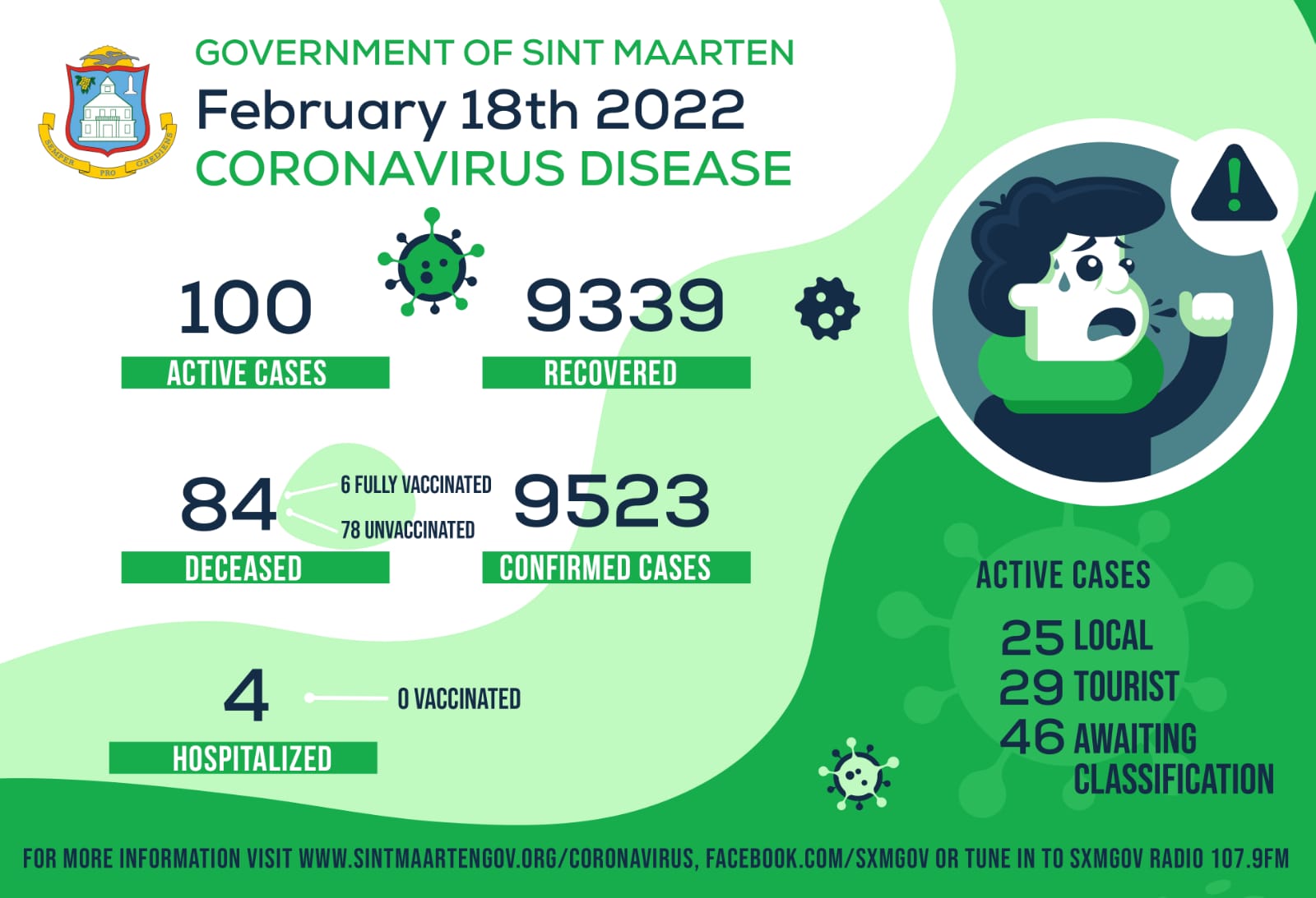 PHILIPSBURG, Sint Maarten - Hasta el 18 de febrero, doce (12) personas que dieron positivo por COVID-19; sin embargo treinta y una (31) personas se han recuperado; disminuyendo el total de casos activos a ciento (100) de los cuales veinticinco (25) son locales, veintinueve (29) son turistas y cuarenta y seis (46) personas se encuentran en espera de clasificación. El número total de casos confirmados ha aumentado a nueve mil quinientos veintitrés (9523).