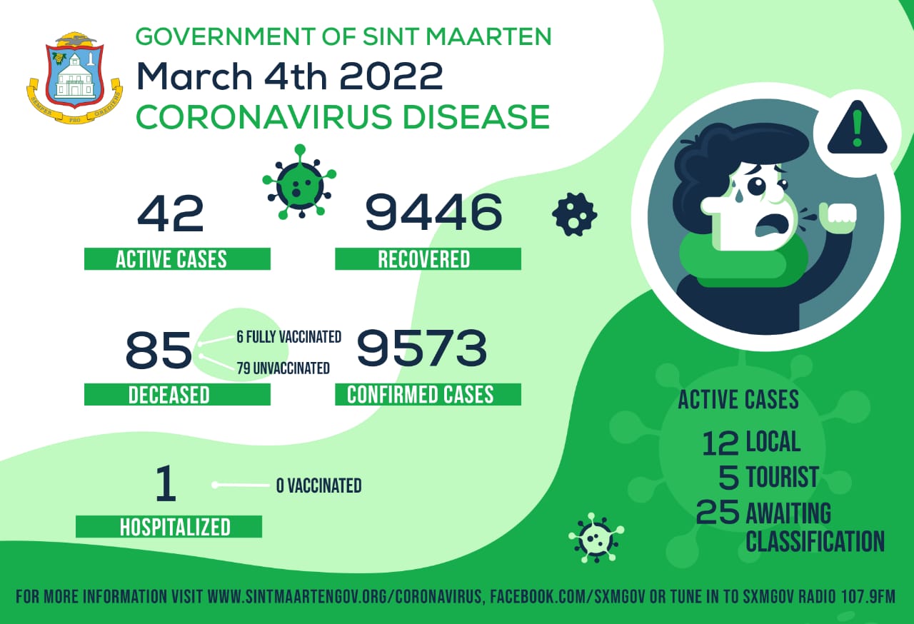 PHILIPSBURG, Sint Maarten – El 4 de marzo, hubo tres (3) personas que dieron positivo por COVID-19; sin embargo ocho (8) personas se han recuperado; elevando el total de casos activos a cuarenta y dos (42) de los cuales doce (12) son locales, cinco (5) son turistas y veinticinco (25) personas se encuentran en espera de clasificación.