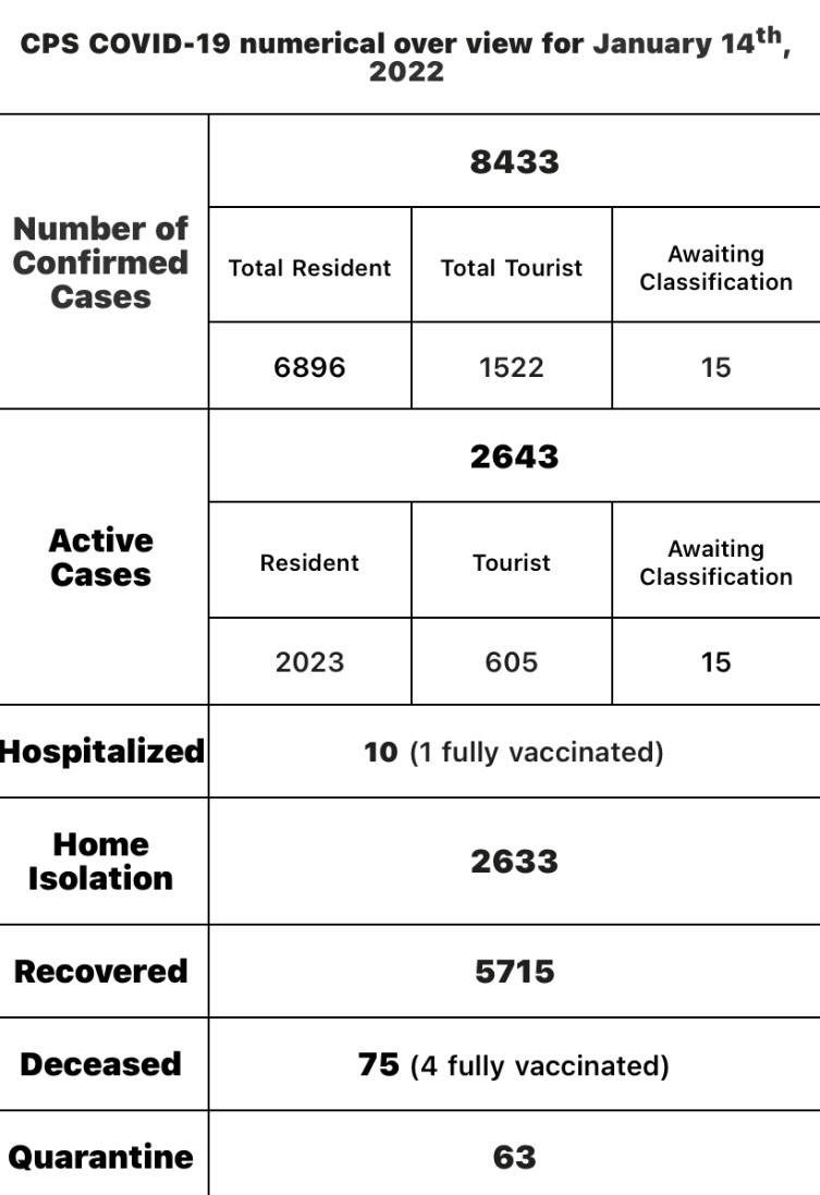 PHILIPSBURG, Sint Maarten – Al 14 de enero había ciento ochenta y tres (183) personas que dieron positivo por COVID-19; sin embargo ciento treinta y siete (137) personas se han recuperado; elevando el total de casos activos a dos mil seiscientos cuarenta y tres (2643) de los cuales dos mil veinte tres (2023) son locales, seiscientos cinco (605) son turistas y 15 personas están en espera de clasificación. El total de casos confirmados ha aumentado a ocho mil cuatrocientos treinta y tres (8433).