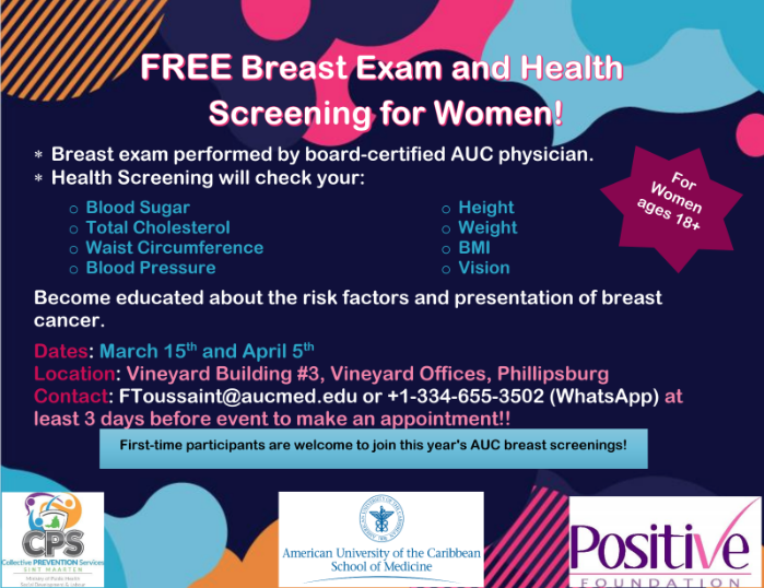 Philipsburg, Sint Maarten – La Facultad de Medicina de la Universidad Americana del Caribe (AUC), los Servicios de Prevención Colectiva (CPS) y la Fundación Positiva se complacen en anunciar exámenes de mamas y evaluaciones de salud gratuitos para mujeres. Estos eventos tienen como objetivo educar y empoderar a las mujeres sobre los factores de riesgo y la presentación del cáncer de mama mientras se recopilan datos para un proyecto de investigación, la encuesta de anomalías mamarias.