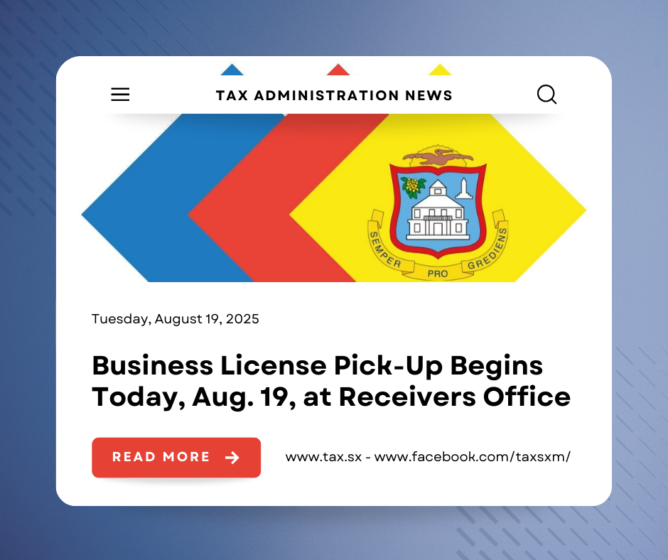 Philipsburg, St. Maarten – La Administración Tributaria de Sint Maarten anuncia que la entrega de licencias comerciales inicia este martes 19 de agosto de 2025, en Receivers Office en Pond Island. Al llegar, los propietarios de negocios deben dirigirse directamente al mostrador/ventanilla de recepción para recoger sus licencias.