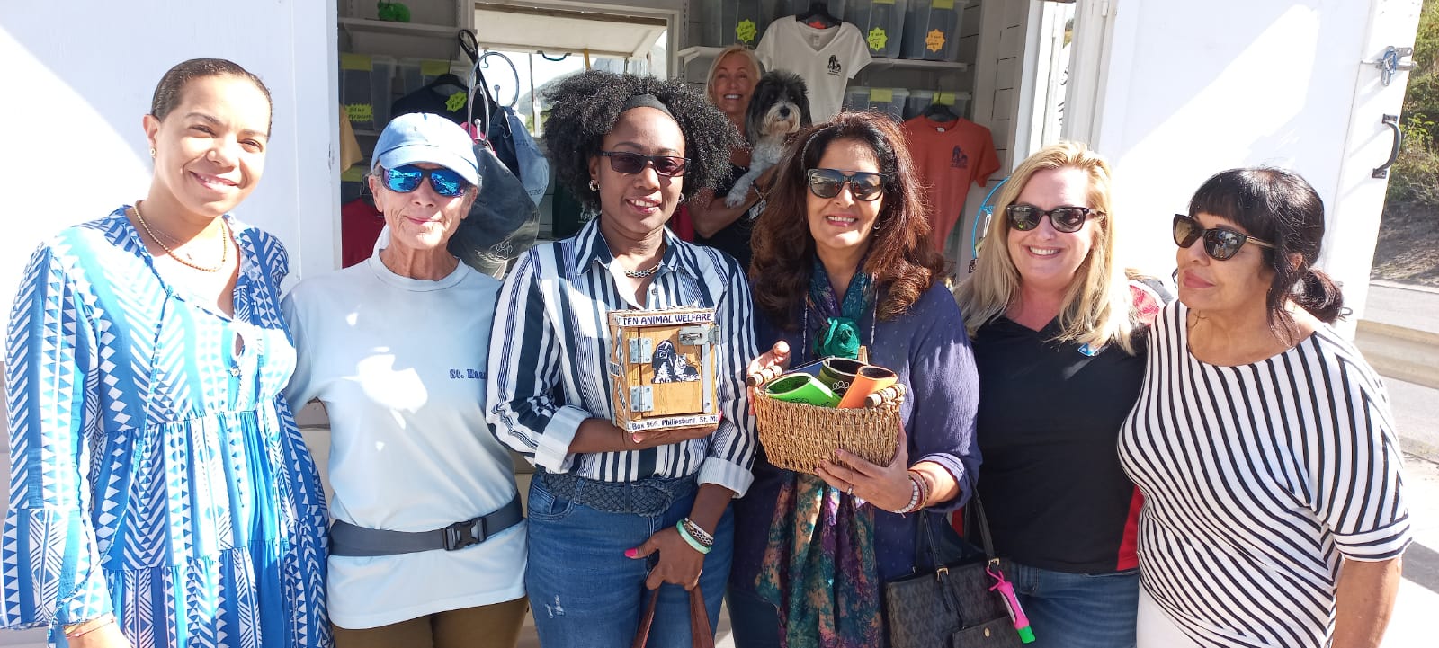 Recientemente visitaron Mutt Hut de AWF en Dock Maarten Island Gems Ludmilla de Weever, y Jody Rosen, Niasha John, Anu Amarnaney y Asha Stevens. The Mutt Hut ofrece numerosos artículos con temas de AWF para la venta, incluyendo camisetas. Las placas de matrícula de Old St. Maarten también se venden para recaudar fondos para las actividades de AWF.