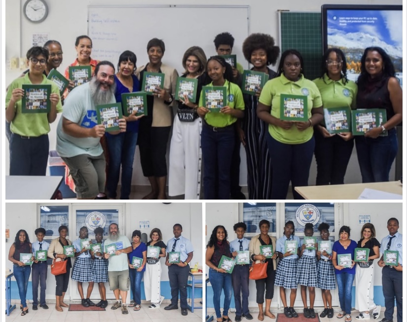 Cupen y Yokoyama se unieron a Island Gems Asha Stevens, Hanisha Alwani, Milva Hoeve y Ludmilla de Weever para la entrega de los dos primeros lotes de libros a la Escuela Secundaria Methodist Agogic Center y la Escuela Secundaria St. Dominic.