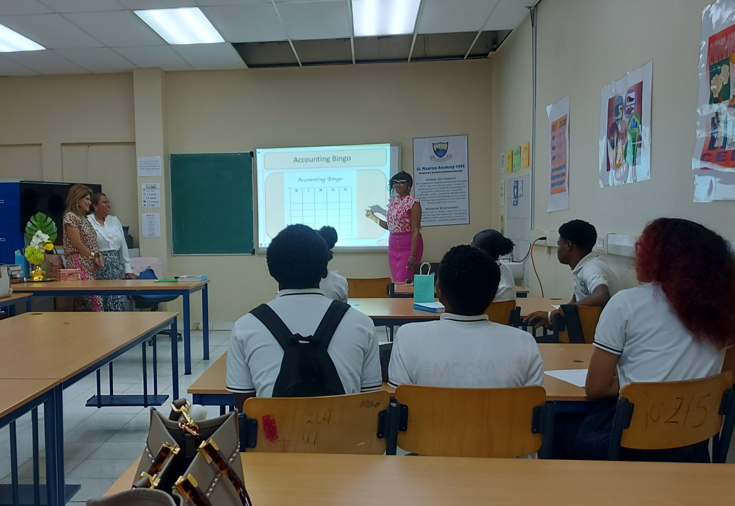 FOTO: Alita Singh y Hanisha Alwani de Island Gems junto a estudiantes, observan una clase reciente de contabilidad en St. Maarten Academy PSVE. La clase utilizó uno de los cuatro proyectores que la Fundación Benéfica Island Gems donó a la escuela.